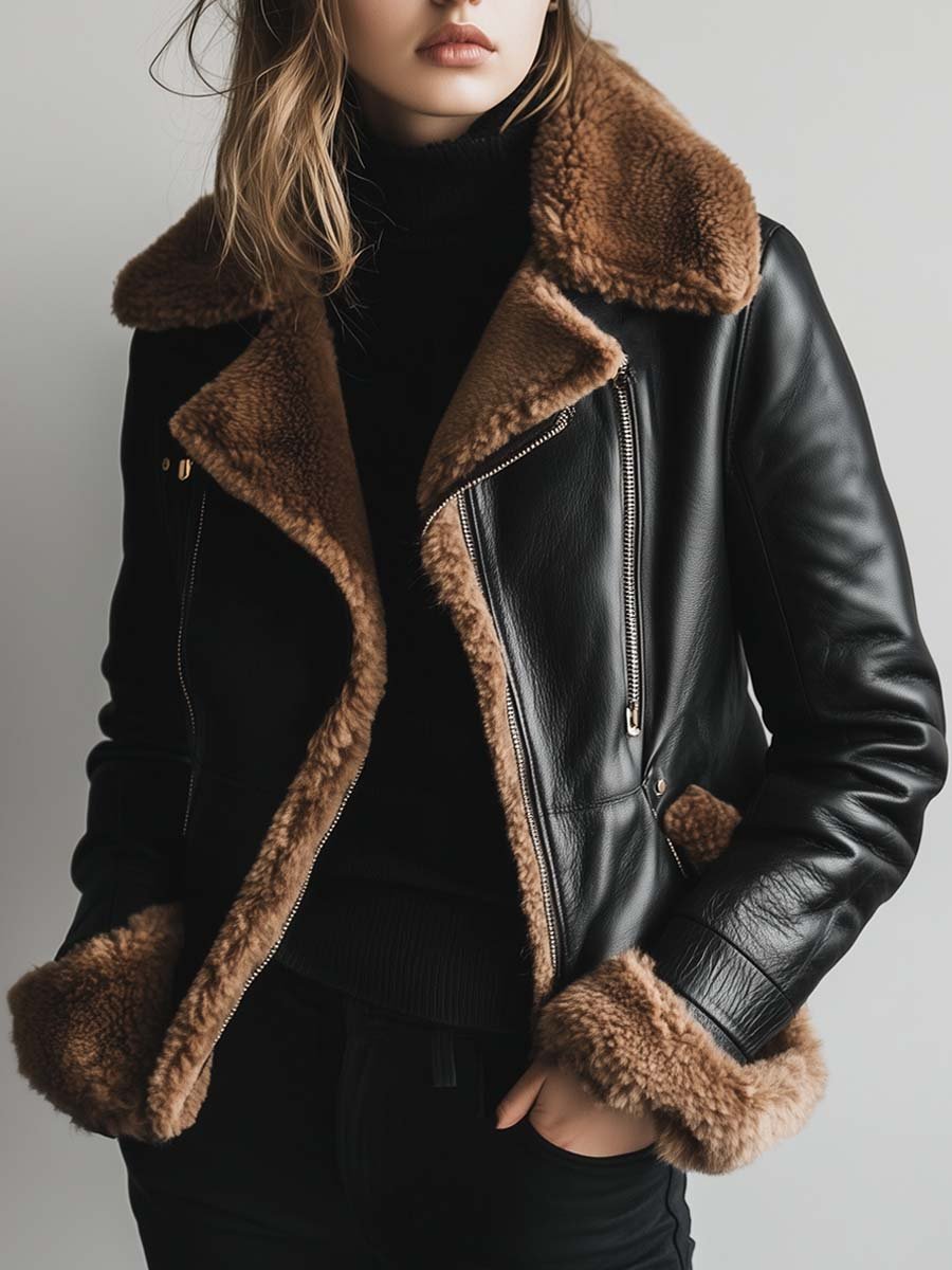 (clearance) Women's Vintage Fur Collar Contrast Faux Leather Jacket