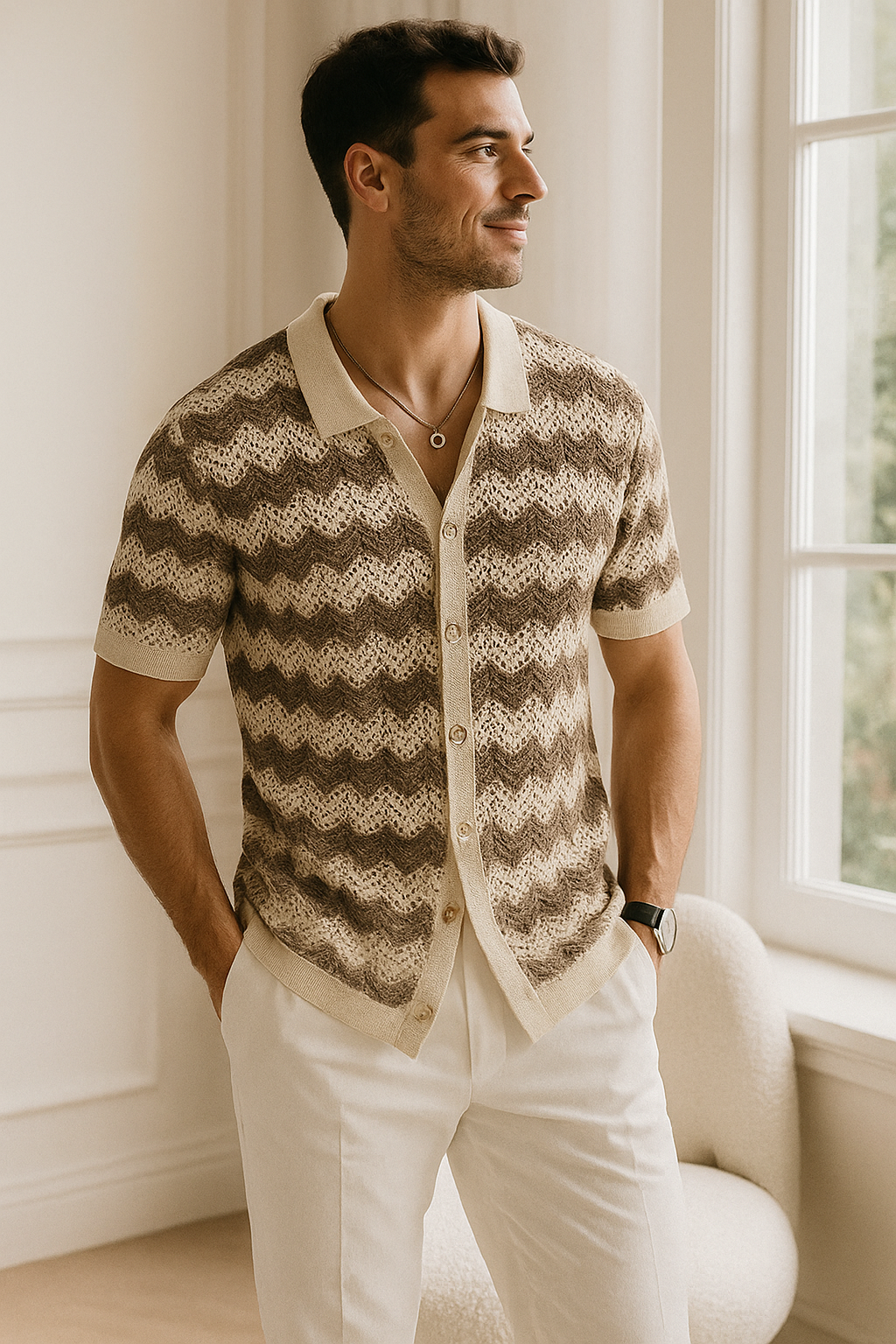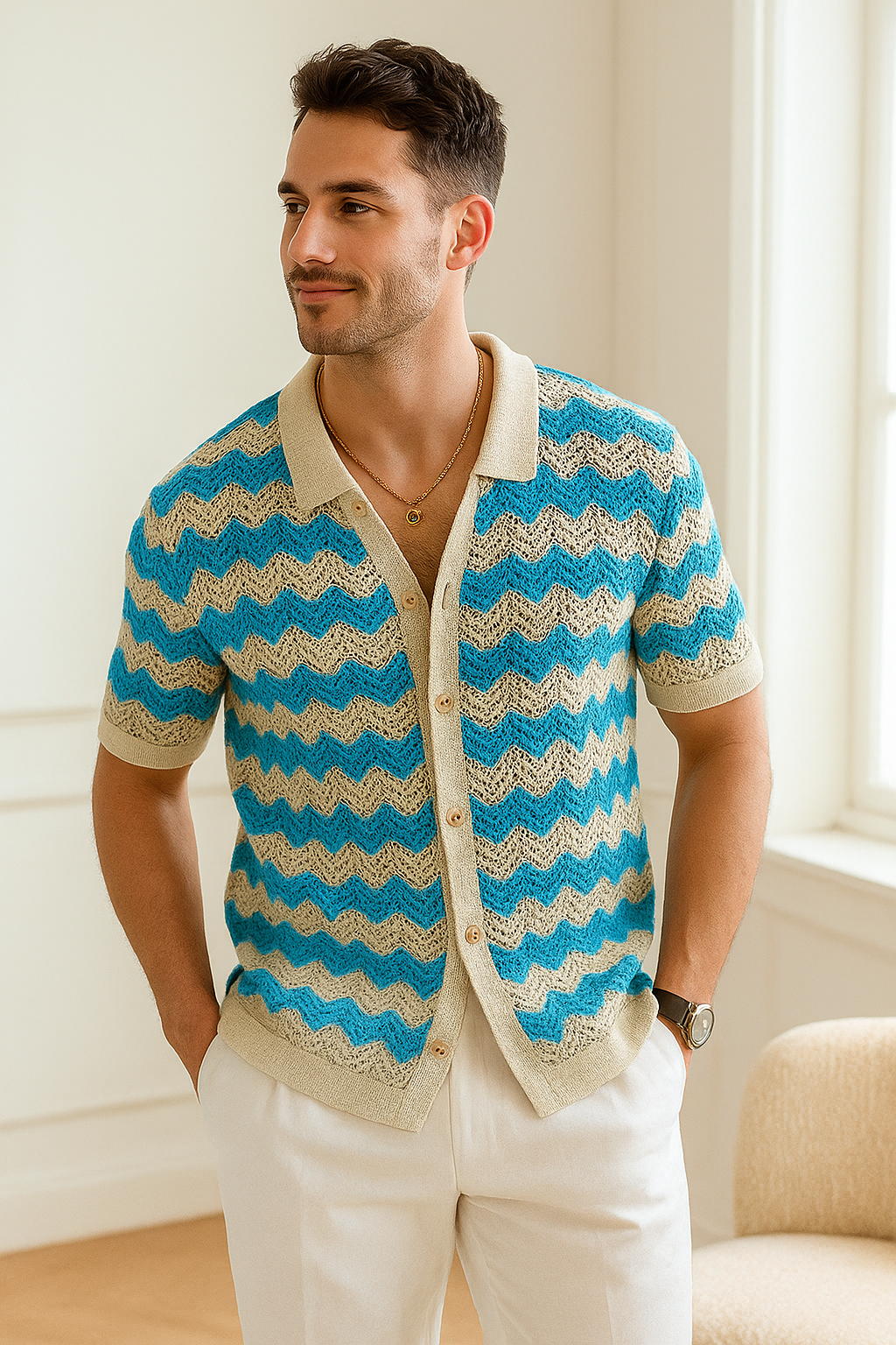 Confectionné dans un tissu respirant à mailles ajourées et orné d'un motif zigzag rétro, le Sunset Zig apporte une touche d'élégance intemporelle aux garde-robes modernes. Sa texture douce et légère vous garde au frais tout en vous assurant un style affirmé, du brunch à la promenade en bord de mer. Chaque détail est pensé pour sublimer votre confiance en vous, car lorsque vous portez le Sunset Zig , tous les regards se tournent vers vous.
