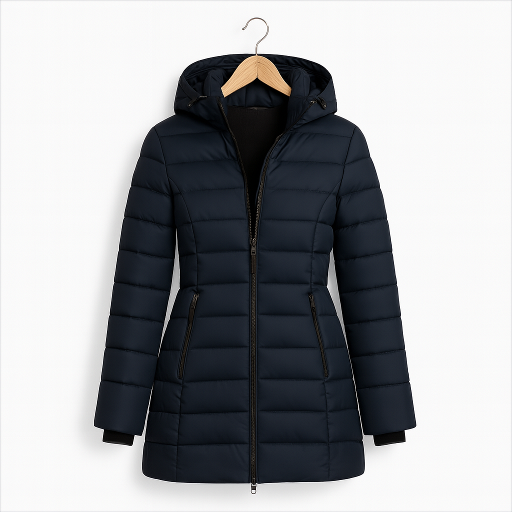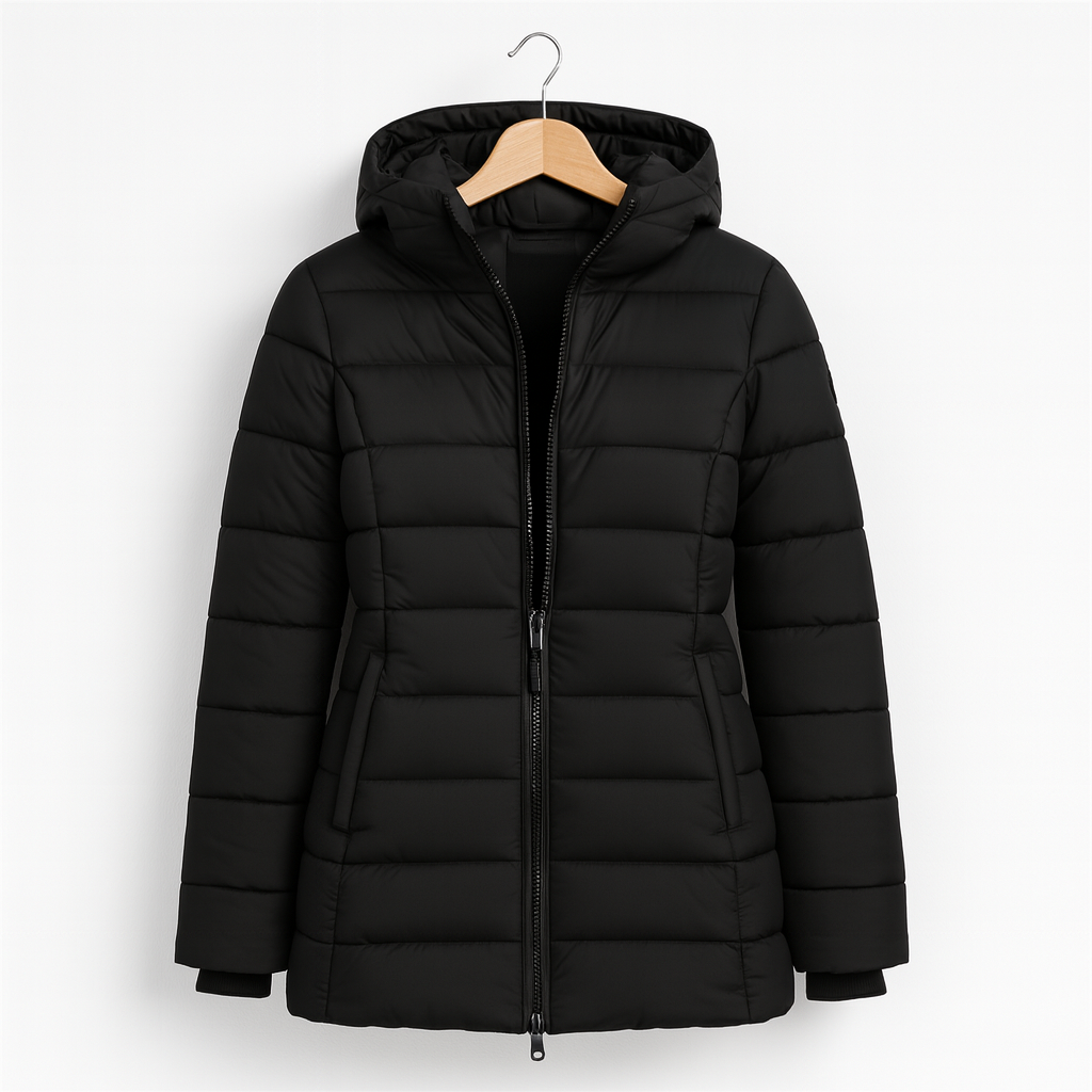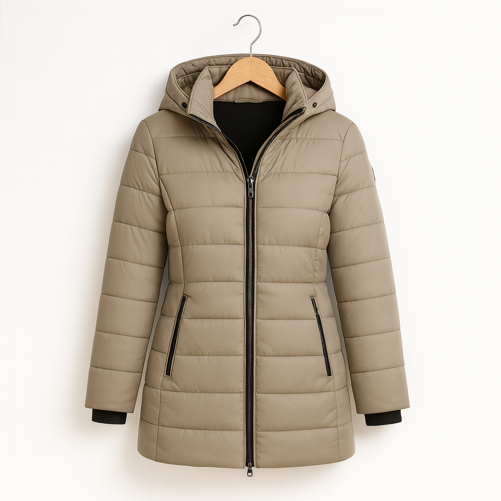 A full-length zipper and insulating hood provide complete coverage against the elements, while the contoured silhouette keeps the look clean, flattering and effortlessly wearable. Whether layered over knitwear or paired with everyday basics, this piece adapts seamlessly to any cold-season setting.
